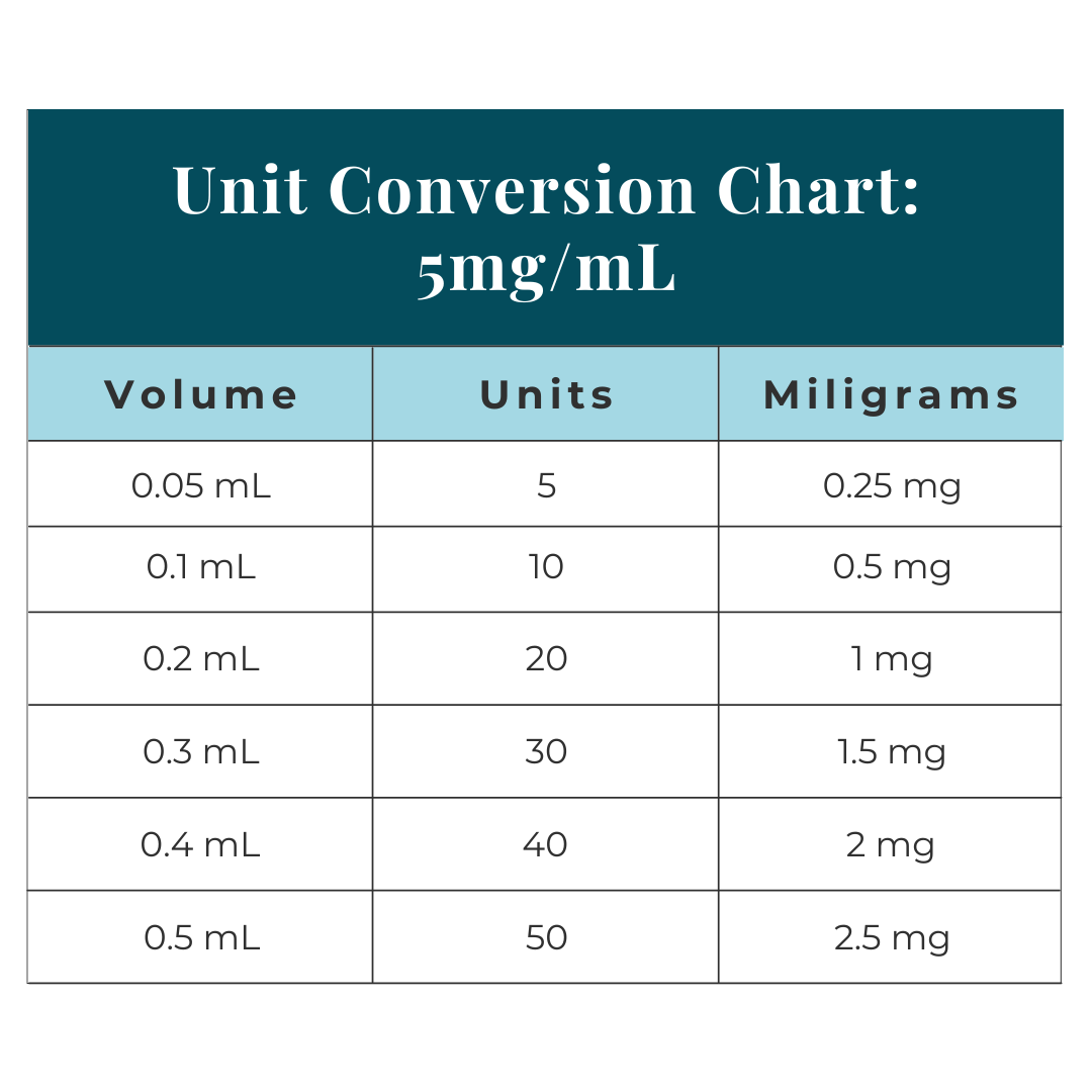 To convert mg to mL: Divide your mg dose by the concentration (e.g., 10 mg/mL). Example: A dose of 5 mg at 10 mg/mL equals 0.5 mL.